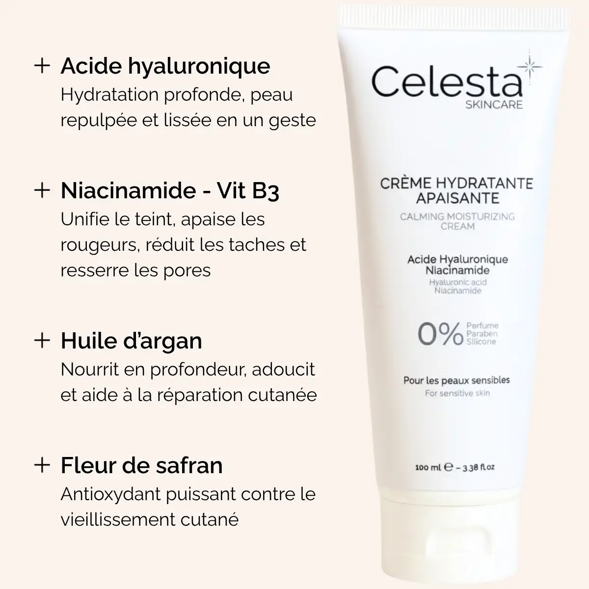 Ce produit ne contient pas de parfum, ni d'ingrédients potentiellement irritants pour les peaux sensibles. Pour consulter la liste des ingrédients bannis chez Celesta Skincare, rendez-vous sur la page Nos formules.