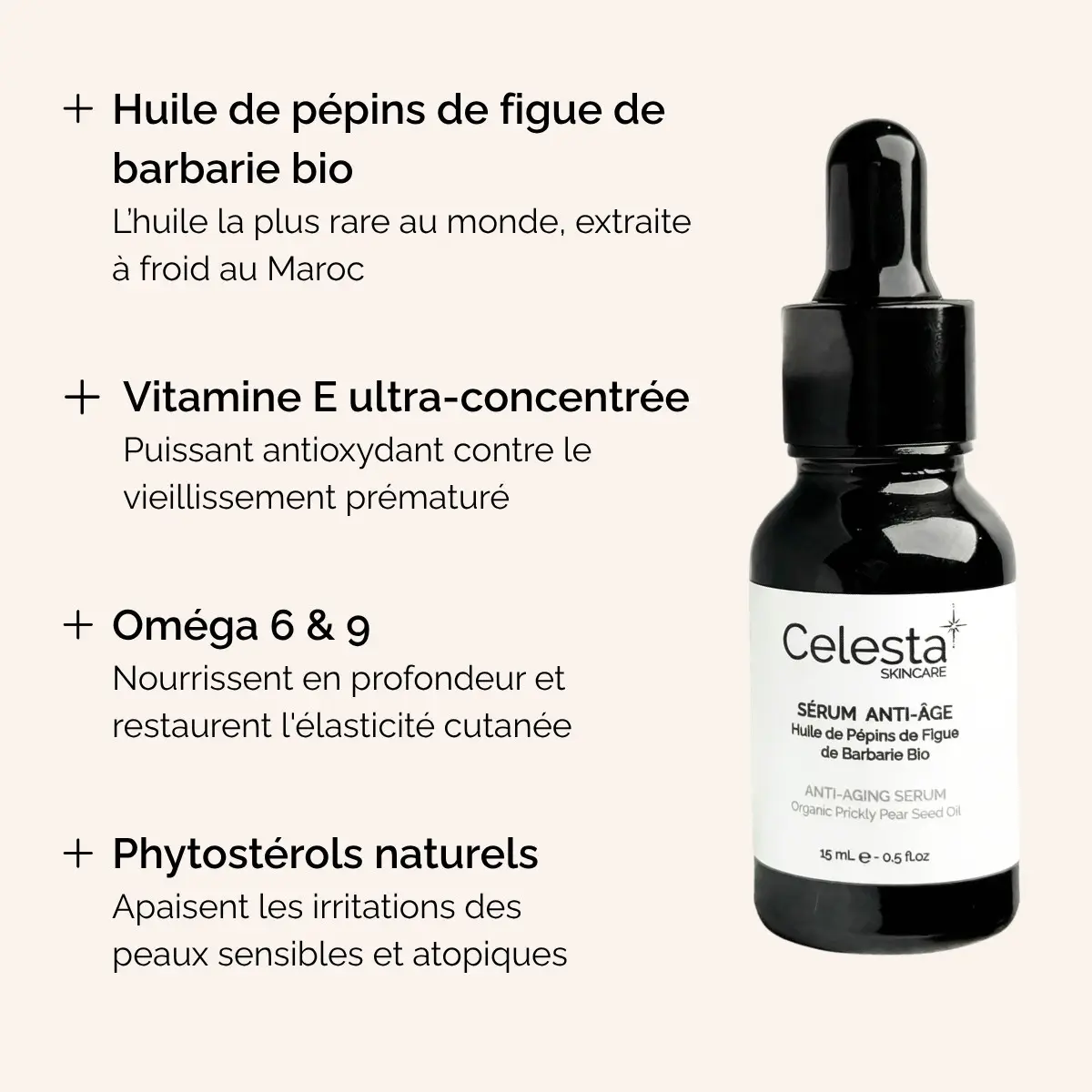 - Action Anti-Âge Globale : Le sérum pur à l’Huile de Pépins de Figue de Barbarie (le plus puissant anti-rides naturel) cible ridules et manque de fermeté.